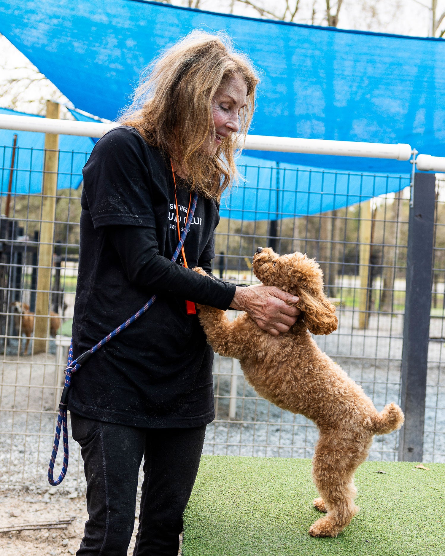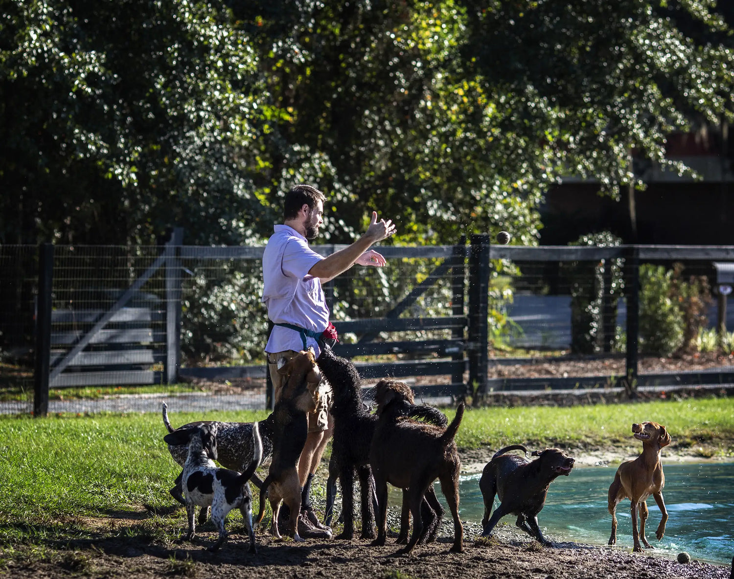 Playcare is all about socializing with pals. We have a large indoor playroom, multiple outdoor play runs, and even a pond for swimming.